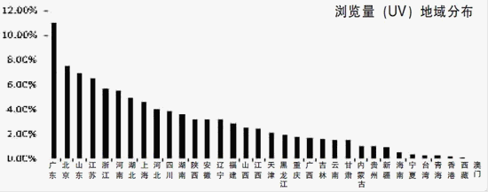 浏览量(UV)地域分布(图表横坐标从左至右分别是:广东 北京 山东 江苏 浙江 河南 湖北 上海 河北 四川 湖南 陕西 安徽 辽宁 福建 山西 江西 天津 黑龙 重庆 广西 吉林 云南 甘肃 内蒙 贵州 新疆 海南 宁夏 台湾 青海 香港 西藏 澳门)