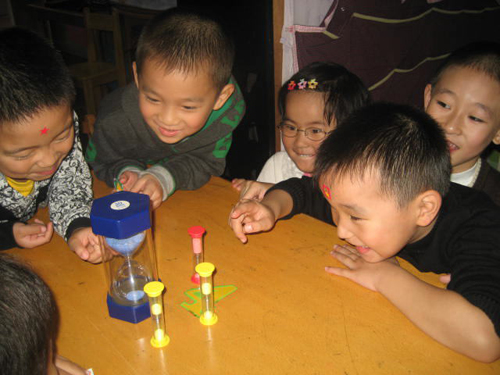 孩子进入大班后,我开始重点对他们进行惜时、守时的习惯培养,组织孩子看时钟、认时间的活动、给孩子限定时间活动等。虽然使用了多种方法,但是孩子们做事拖拉的现象仍然存在:洗手、喝水要磨蹭半天,午睡起床时边穿衣服边闲聊。用什么办法来解决这个问题呢?偶然发现儿子在家研究沙漏,这启发了我,我尝试着把沙漏运用到教学中,竟然收到了意想不到的效果。