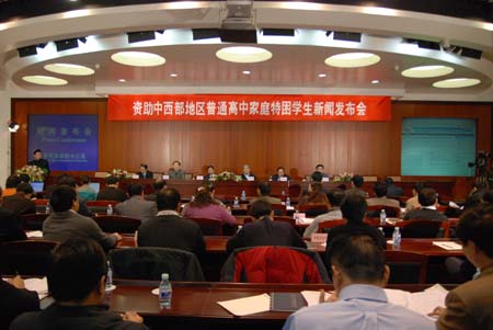 2007年12月21日上午10:00,资助中西部地区普通高中家庭特困学生新闻发布会在教育部北楼二层报告厅举行。以下为文字实录。