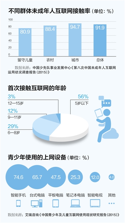 制图:蔡华伟 五六岁的小娃娃,怀里抱着手机,指尖熟练地在屏幕上滑动,“西瓜”切得飞快;一吃完饭,就蹭到电脑前,打开视频网站,边看“光头强”边哈哈大笑;晚上总得听一集《晚安小绵羊》,否则就闹腾着不愿睡觉……这样的场景在今天这个互联网时代变得司空见惯。 中国互联网信息中心统计显示,截至2015年底,中国网民总数已达6.88亿,19岁以下网民占全体网民的24.1%,其中年龄低于10岁的网民超过1800万。“小网虫”越来越多,怎样趋利避害,引导儿童安全上网?如何抵御侵害,构建安全网络环境?这些值得关注。 上网低龄化成为普遍现象 “孩子是从几岁开始接触网络的?” 湖北武汉的秦女士想了想说:“应该是两三岁吧。孩子一哭闹,怎么哄都哄不好,我就给孩子看手机上的图片和动画,孩子立马就安静下来了。久而久之,我就习惯用这样的方式来转移孩子的注意力了。但我发现这其实是一种错误的方式,现在孩子每天都想看动画片,不给他看还耍脾气,真是令人头疼。” 在中国,像这样的“小网虫”已成为互联网大军的重要成员。不久前,腾讯公司发布了《儿童安全上网指引报告》,数据显示,90%的中国儿童(指18岁以下未成年人)在日常生活中接触互联网,其中城市儿童触网率近95%。儿童首次触网年龄也越来越小,报告指出,56%的儿童初次上网年龄低于5岁。 “今天是一个互联网时代,儿童就生活在这样的环境中,互联网就是他们的生活方式,他们是真正的‘网络原住民’。”“青年之声”青少年成长服务联盟专家孙宏艳说,“我们常常会看到这样的现象,家长用小游戏逗孩子玩,给孩子拍小视频,甚至有些母亲一手给孩子喂奶,一手还拿着手机刷朋友圈。环境如此,孩子不可避免地耳濡目染,因此,上网低龄化也是正常现象。可以预测,网络进入儿童生活世界的时间将越来越早,程度将越来越深,网络必然成为影响儿童生活的重要力量。” 网络风险往往更隐蔽 提起孩子玩手机玩电脑,安徽省合肥市天鹅湖小区的宋先生就一肚子气。“孩子一玩起游戏就停不下来,还把眼睛弄近视了。”宋先生叹了一口气,“网络中的不良信息真是让人防不胜防。”山东省枣庄市的袁先生经常被网站上的意外弹窗吓一跳:“浏览新闻的时候,看着看着突然就蹦出一个对话框或者小视频,内容很多都是不健康的。作为家长,我很担忧,如果孩子看到这样的信息,会不会因为好奇点进去观看呢?” 儿童上网面临许多风险。在腾讯发起的“儿童网络保护大调查”中,网络诈骗、不良信息、网络欺凌成为孩子在上网过程中遭遇的三大危险,其中网络诈骗比例最高,占61%。中国青少年研究中心2016年最新发布的数据也显示,中国高中生遭受网络侵权的现象非常突出。47.2%的高中生有过网络密码被盗的经历,42.3%在网上收到过虚假的付款要求,17.0%网上购物曾被欺骗。此外,在网上被威胁恐吓的有7.5%,个人照片或视频在网上被恶意传播的有7%,在网上遭到过团伙欺负的有5%。 网络诈骗和盗号易导致财产风险;长期关注不良信息易诱发违法犯罪;网络欺凌和骚扰易造成心理伤害……而相比于日常生活中的风险而言,网络风险因为脱离学校和家庭的视线,所以往往更加隐蔽,更容易导致严重后果。 家长无需谈网色变 随着孩子年龄的增长,青少年使用网络的频率越来越高,使用网络的目的也会发生变化。《儿童安全上网指引报告》显示,对于8岁以下低学龄和学龄前儿童来说,看视频、玩游戏、听故事等娱乐是上网的主要目的;而对于高年级小学生和初中生,玩游戏和写作业占据了他们的大部分上网时间。 儿童上网到底好不好?调查数据显示,在成人受访者中,认为儿童使用网络利大于弊的占26%,认为弊大于利的占34%,其余则认为不好说。77.4%家长会对儿童使用网络进行正面干预或者引导,总体上家长对孩子的上网安全比较关注。 “套用一句老话,互联网确实是一把‘双刃剑’。”中国青少年研究中心副研究员赵霞说,“家长对儿童上网的忧虑表现在很多方面。首先是对健康的影响,担心屏幕阅读影响儿童视力,久坐影响儿童生长发育;其次是对学习认知的影响,担心上网容易造成儿童学习分心、抽象思维减损等;三是对行为的影响,担心儿童接触不良信息,模仿不良行为;第四是对性格的影响,担心儿童缺少社会互动,人际交往能力降低,等等。这些担忧不无道理,但家长也无需‘谈网色变’。毕竟网络的便利与共享,给儿童提供了新的学习方式、思维方式、生活方式、交友方式。上网是儿童从小就应该掌握的重要能力。” 营造网络安全环境 如何规避儿童上网风险?腾讯联合科普中国推出的《数字小公民安全成长指南》建议,青少年不要随意透露个人隐私和关键信息,不要轻信网络上的各类“免费午餐”,不要理睬不良信息,不要随意打开奇怪的链接或陌生人发来的邮件,不要单独与陌生网友见面。另外,一旦发现不妥之处,需第一时间和父母商量。 网络是一个公共场所,让网络安全意识落地生根、让网络空间环境风清气正,需要各方共同努力。 帮助孩子从小养成良好的网络使用习惯,培养必须的媒介信息素养,家长应负起第一责任。专家建议“疏而不堵”,适度上网,根据孩子年龄段选择合适的数字产品。 “有的家长认为我自己不上网,家里不接网、不用电脑,这样孩子就安全了。但我们的调查发现,家长越是拒绝网络,孩子上网成瘾的