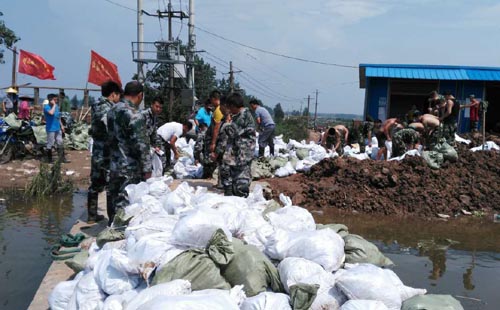 - 安徽:教师抢险队把400个百斤沙袋堆在圩堤上07-06