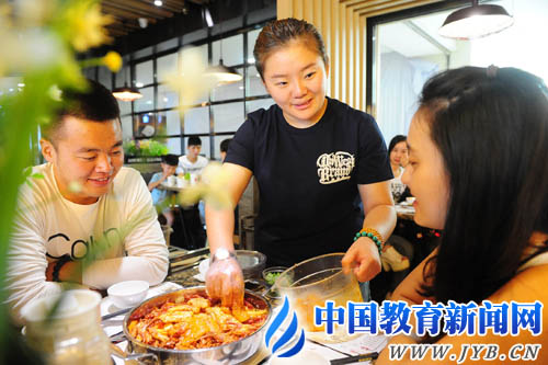 近日,安徽省阜阳市大学毕业生段慧婷(中)在自己创办的餐馆里为食客做焖锅。2011年,段慧婷在阜阳职业技术学院大二时开始创业,开了一家餐饮店,后来生意越做越大,先后涉足酒吧、工程投资等多个行业。如今,她在阜阳及蚌埠等地已拥有11家实体店面,并成立了一家餐饮企业管理公司,成为创业新秀。(王彪 摄) 《中国教育报》2015年10月13日第1版 |