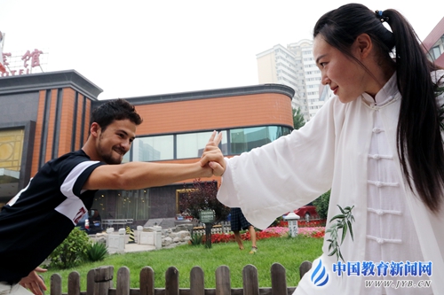 喜爱中国武术的外国球员,在驻地与太极拳师比拼推力。