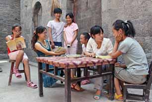 北川中学在震后对残疾和家庭困难的学生实施补助,初一学生周丹阳(右)每月可得到250元的生活费。记者日前在校园里看到他们愉快的笑脸。本报记者吴力田摄 |