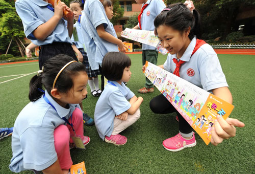 翻翻书绘画作者之一、六年级学生何欣蔚(右)在向几名一年级新生讲解书中的文明礼仪内容。 日前,江苏省南京市游府西街小学学生利用暑假绘画创作的“学生礼仪翻翻书”《我的一天》在新学期开学典礼上“出版”,发放到每位同学手中。这本翻翻书以图画和顺口溜的形式,提示大家每天需要注意的文明礼仪规范,包括上学、课堂、课间、集会、用餐、运动、放学等各个方面。新华社记者 孙参 摄 |
